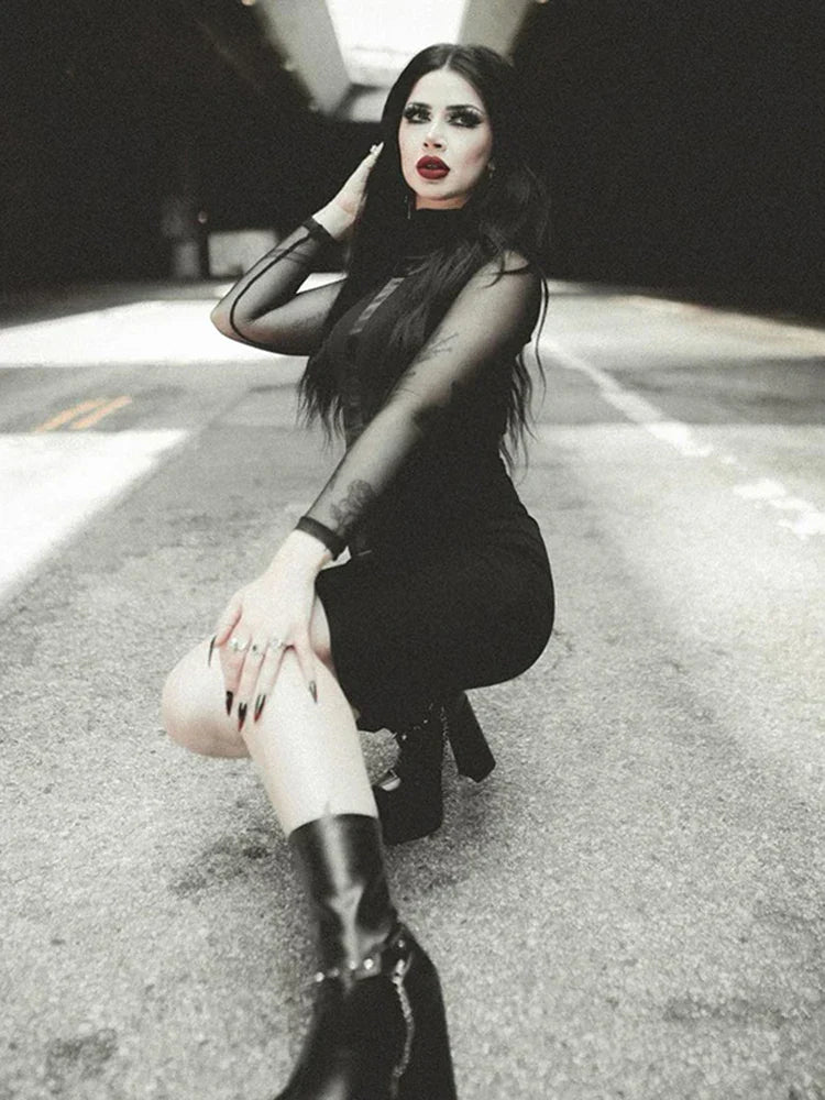 Mesh Long Sleeve Bodycon Midi Evening Party Club Cross Patchwork Ruched Irregular Hem Dress