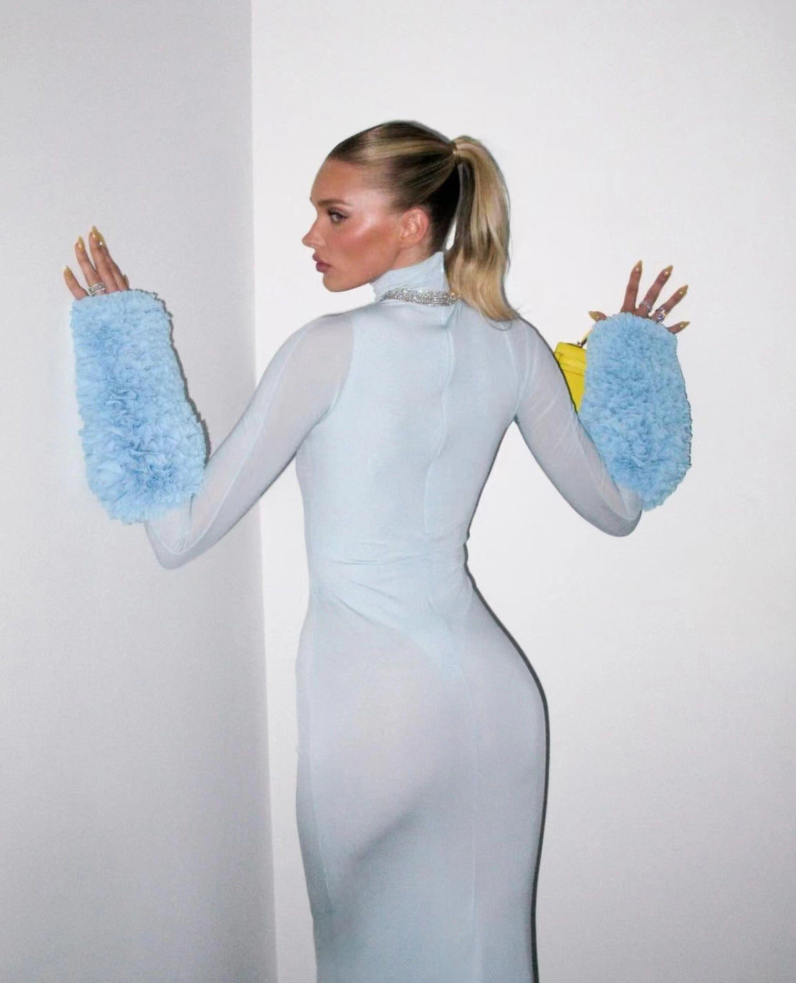 Glamorise your date nights, club night or birthday fits like never before. Our Virelle Maxi Dress has turtle neck and full sleeves with fur details on the sleeves