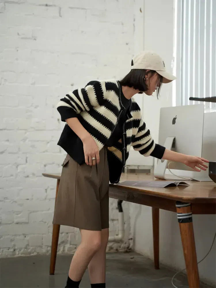 Stride with a sporty flair in this striped cardigan. Its button-front allure is complemented by a wide neckline, lending an athletic touch. Woven from acrylic, its slightly cropped design ensures you stay cozy while making a style statement. A must-have for women who wear their spirit on their sleeves.