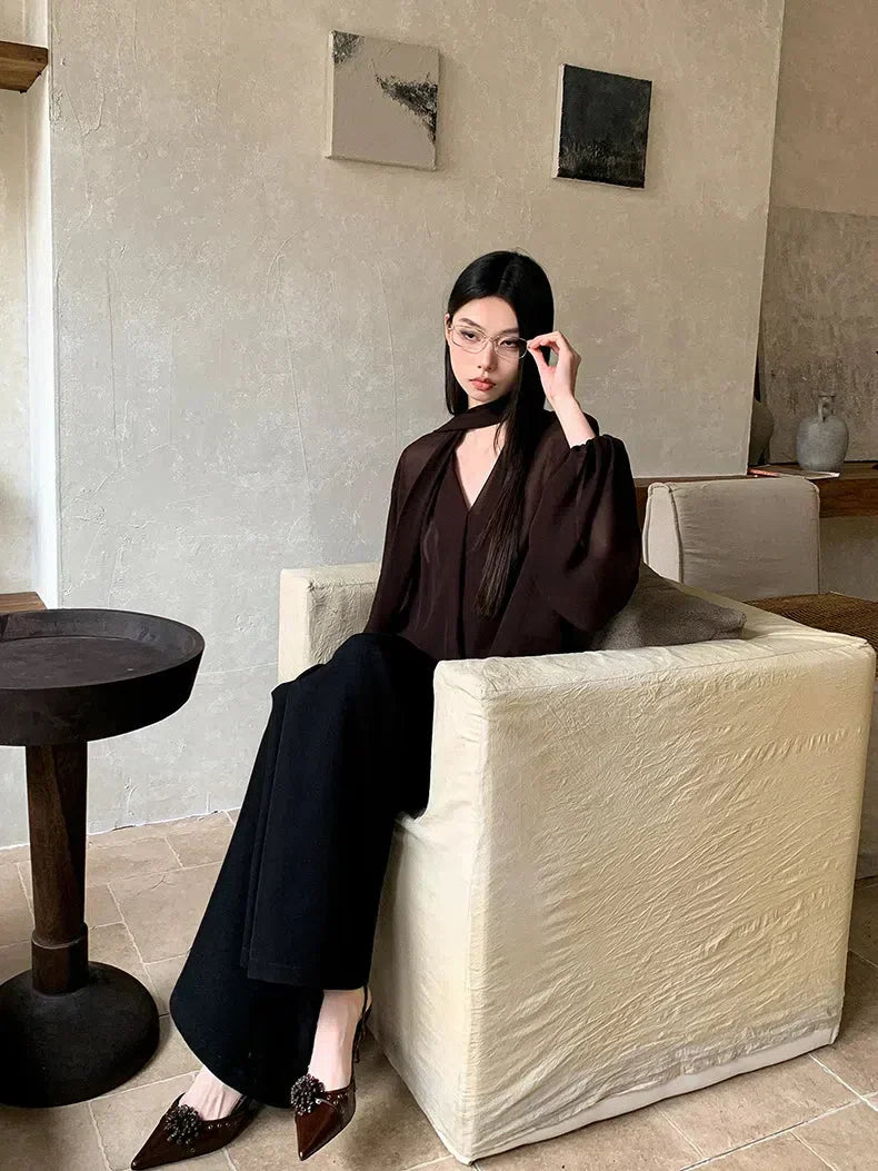 This neck tie sheer mesh blouse blends elegance with a modern edge. The lightweight, flowy fabric drapes beautifully, while the detachable tie detail adds a chic touch. Perfect for layering over camis or styling with high-waisted bottoms.