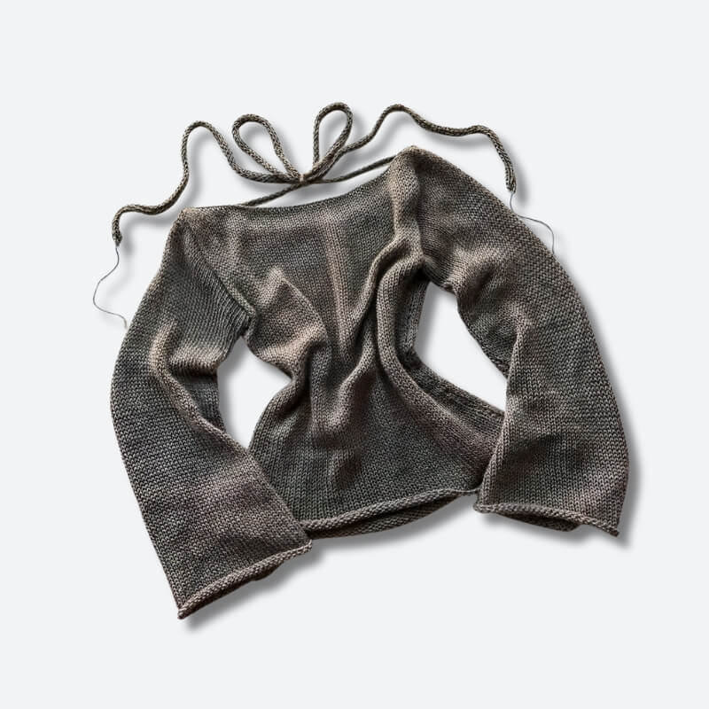 Elevate your winter wardrobe with this chic, open-back knitted sweater. Crafted with precision, its neutral hue effortlessly complements any outfit. The tie-back detail adds a dash of contemporary flair, making it a must-have for fashion-forward individuals. Pair with a pleated skirt for a harmonious ensemble. Perfect for those looking to blend coziness with style. Ideal for trendy, cold-weather looks.