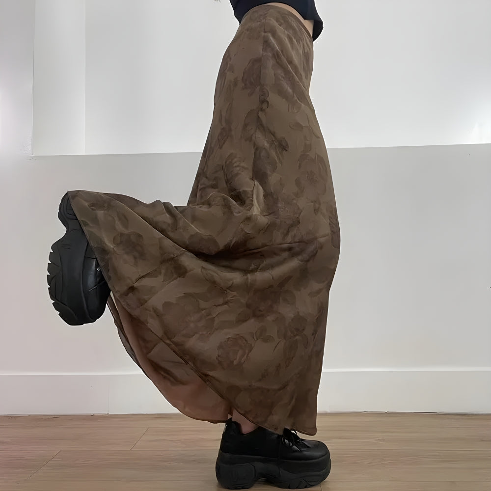 Embrace the fairy grunge aesthetic with this enchanting floral printed maxi skirt. The low rise and brown inner lining add a vintage touch, perfect for festival wear or casual fall days. Its whimsical design is sure to captivate and charm.