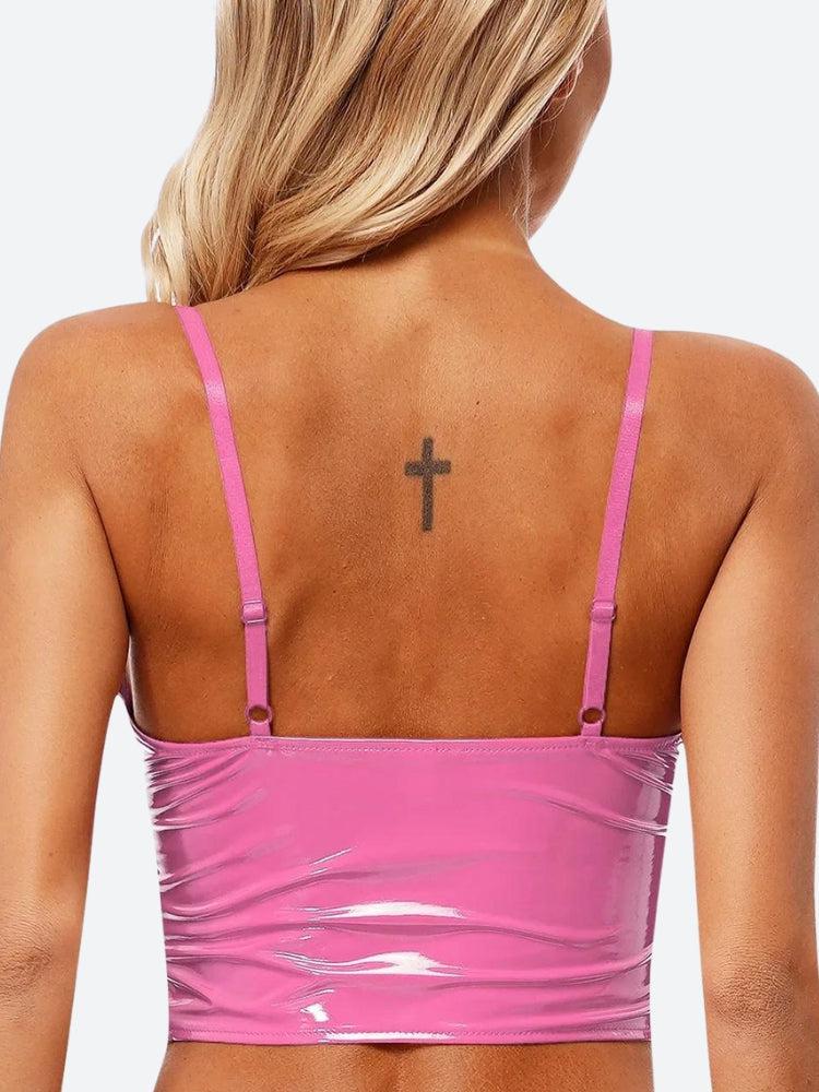 Make a statement with this faux patent leather bustier crop top. The glossy finish and front zip add bold flair, while adjustable straps and a cropped fit make it perfect for pairing with high-waisted jeans or skirts.