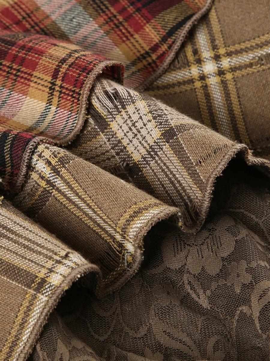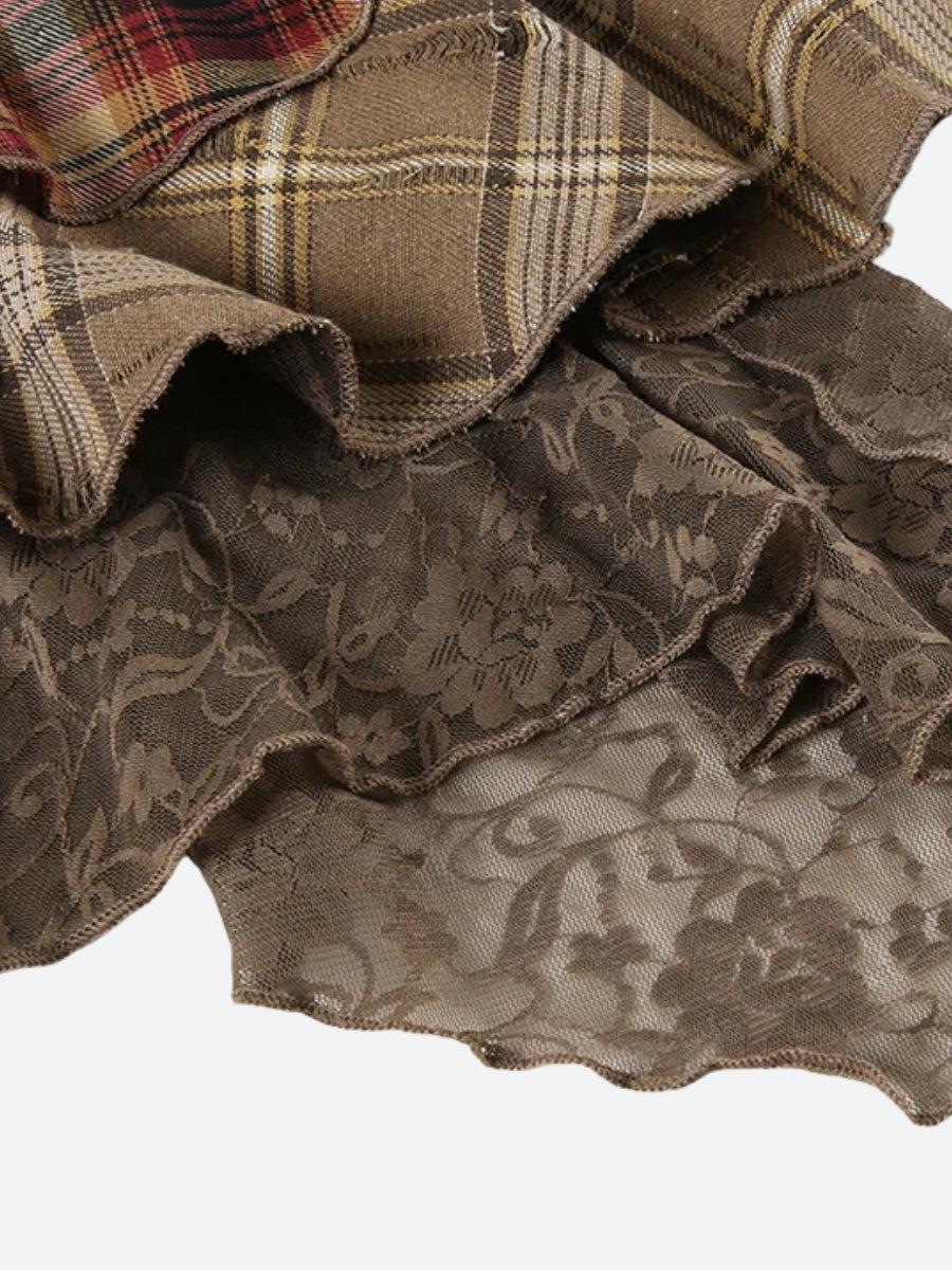 Where fairycore meets rebellious grunge. This asymmetric mini skirt features layered patchwork plaid, rustic faux leather, and delicate lace panels that create an effortlessly edgy silhouette. The cascading hem and mixed textures give it a handcrafted, magical vibe that feels straight out of a fantasy realm.
