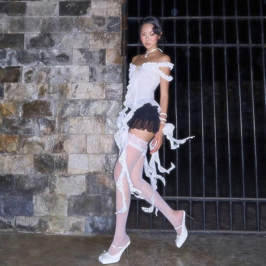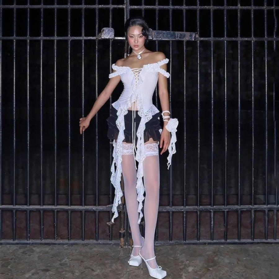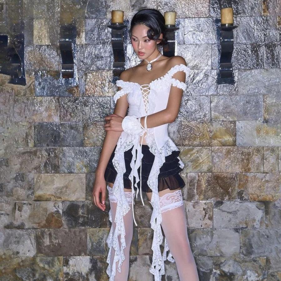 This lace ruffled top blends baroque fantasy with gothic edge. Designed with off-shoulder ruffle sleeves, a lace-up corset front, and layered asymmetrical lace trims, it’s pure drama from every angle. Romantic, rebellious, unforgettable.