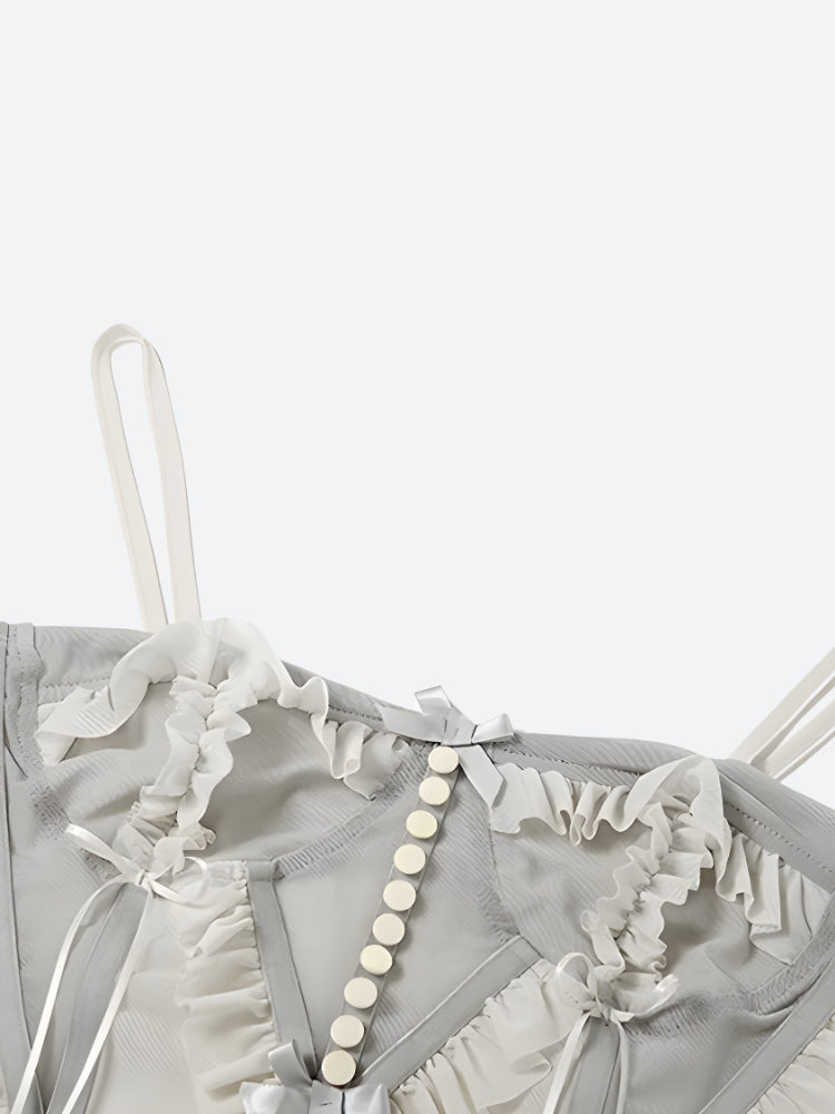 Float into the fairycore dream with this ruffled mesh two-piece set. The sheer corset-style top features delicate lace, bows, and ribbon trims, paired with a matching layered mini skirt. Soft, lightweight, and flirty—it's your whimsical summer go-to.