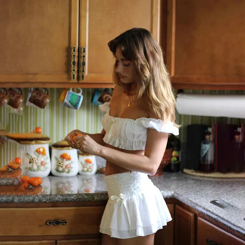 Flirty ruffles, delicate bows, and a shirred fit define this two-piece set. Perfect for coquette moods or soft girl days, this crop top and mini skirt combo brings romance to the everyday.