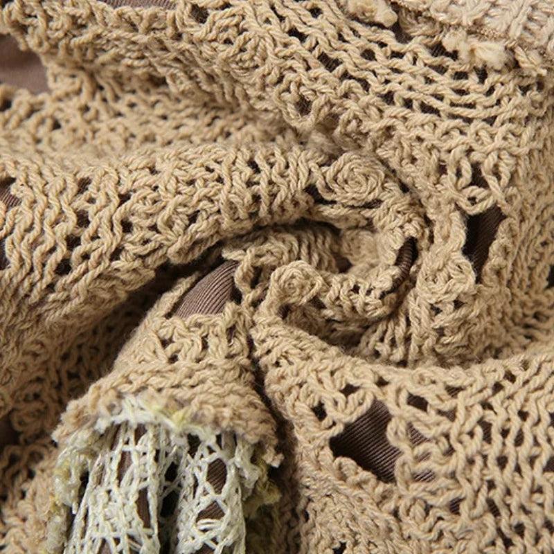 Layered crochet, contrast textures, and an asymmetric hem, this boho mini skirt blends art and edge. With a stretchy waistband and draped net overlay, it's made for earthy streetwear looks, barefoot beach days, or pairing with slouchy boots and off-shoulder tops.