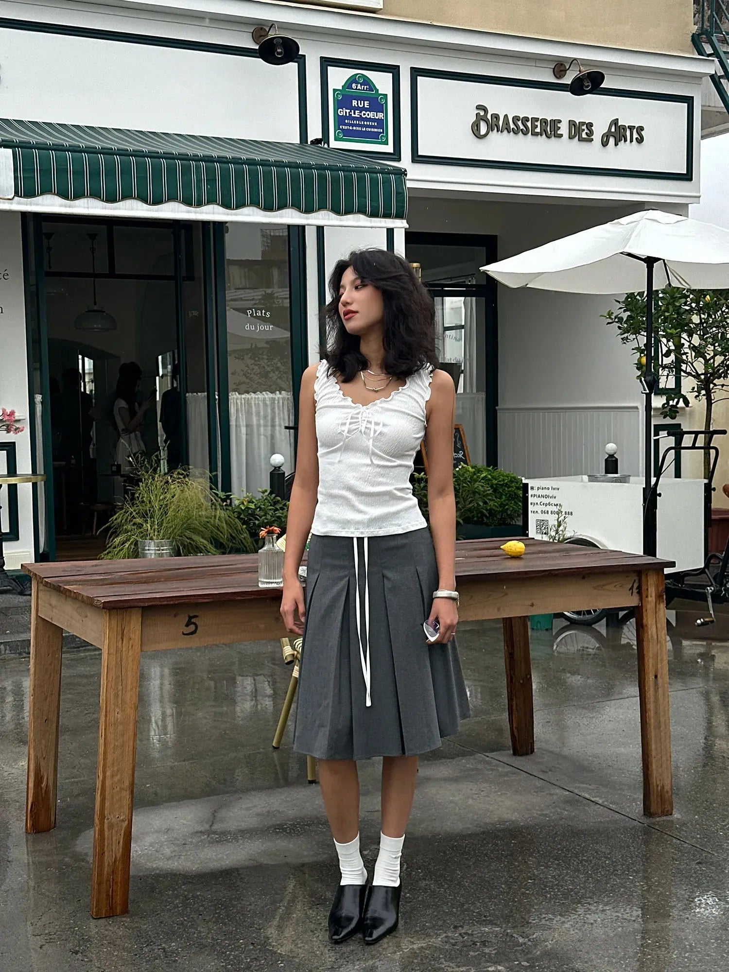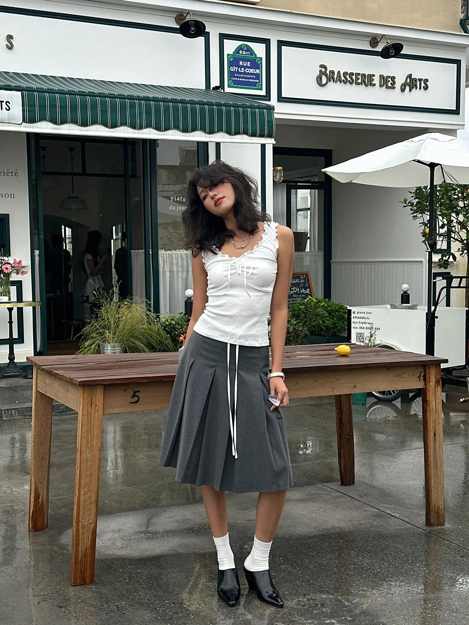 Ruffled edges and a tie-up front meet soft, stretch-kissed texture for a top that blends girly charm with casual flair. Fitted to flatter and easy to pair with low-rise skirts or wide-leg jeans, it’s a go-to look for café dates, gallery strolls, or snapping pics with a soft-grunge filter.