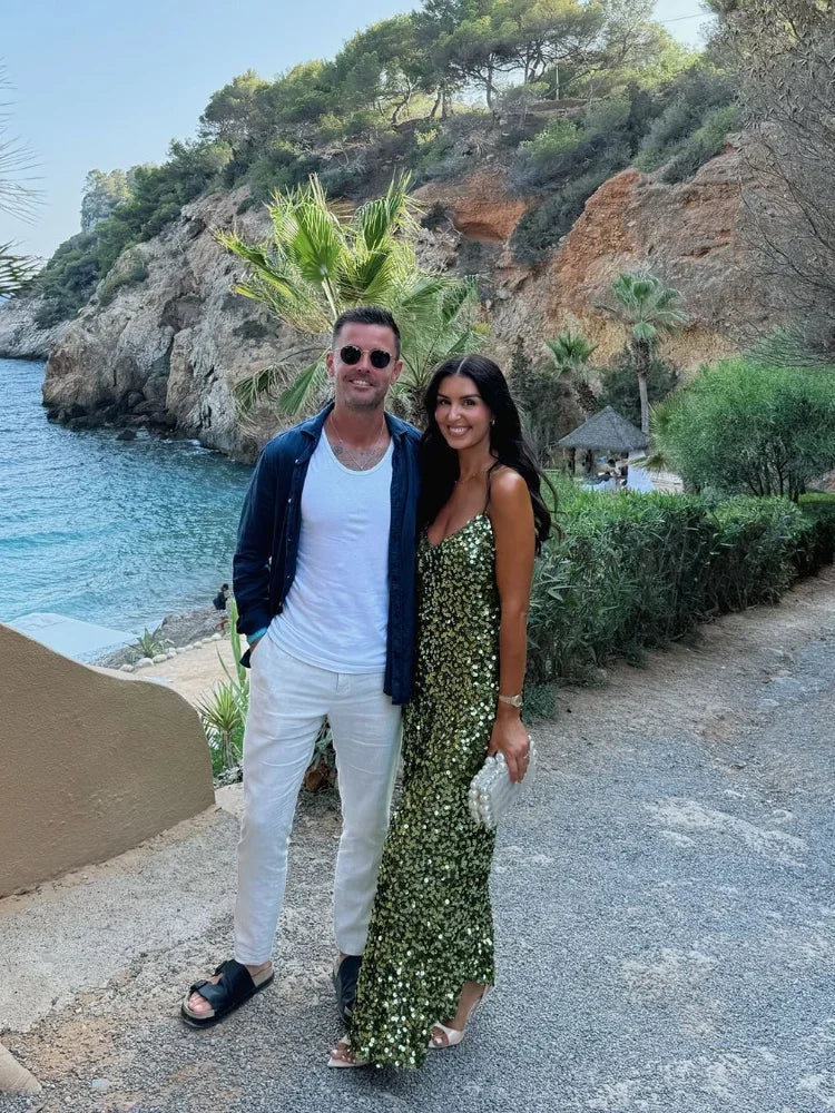 Green Sequin Backless Sling Dress - Sexy Off Shoulder Christmas Party Dress