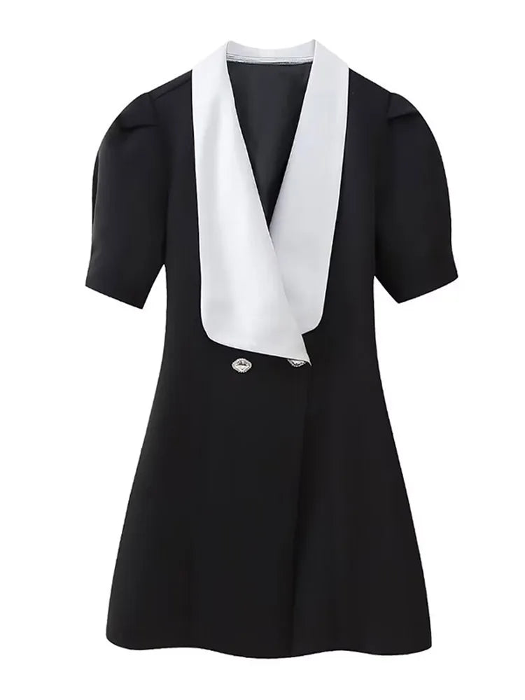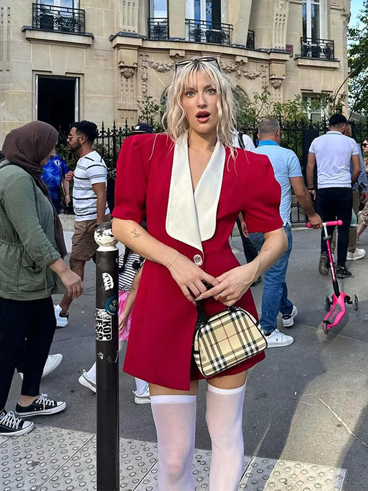Red Button Mini Dress with V Neck - A-Line Christmas Party Dress