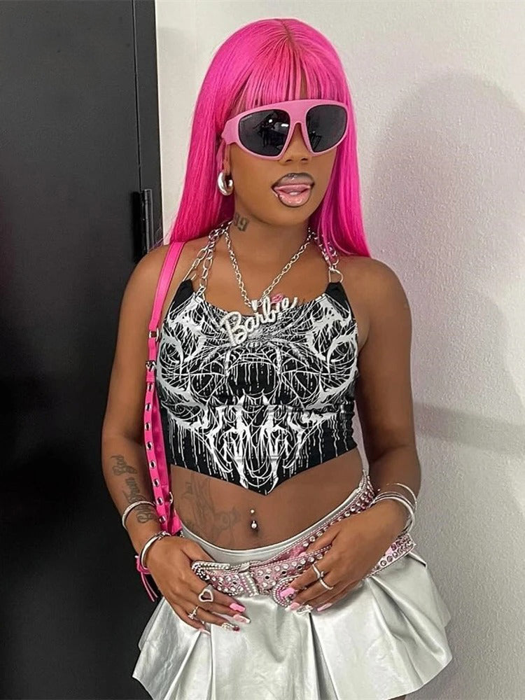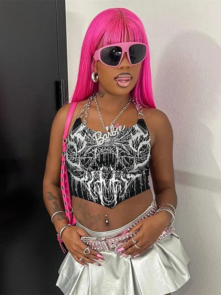 Gothic Black Graphics Chain Low-Neck Backless Crop Top