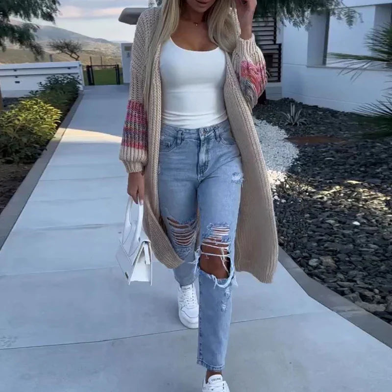 Patchwork Tassel Fashion V-neck Rib Knitted Printed Lantern Long Autumn Winter Coats