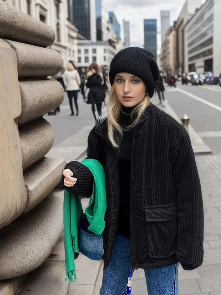 Corduroy Loose Solid Pocket Oversize Fashion Long Zipper Coats