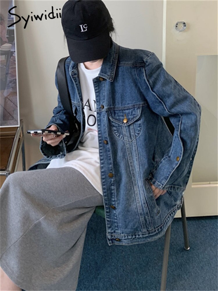 KittenAlarm - Vintage Jeans Jacket for Women 2024 New Korean Fashion Long Sleeve Turn Down Collar Coats Chic Casual Oversized Jackets