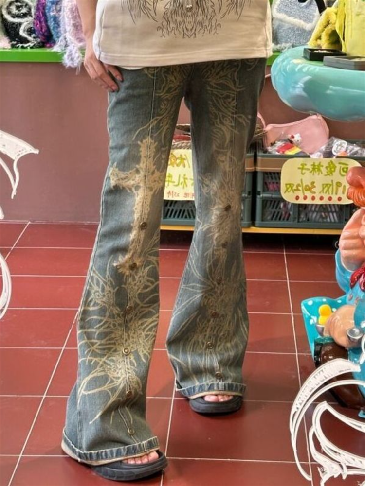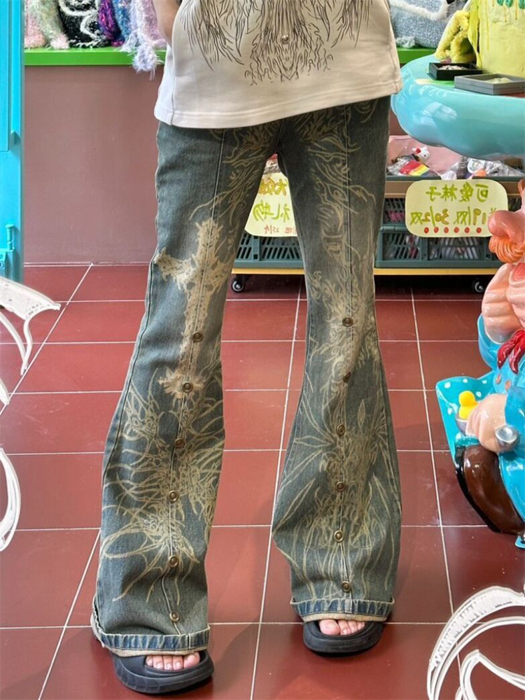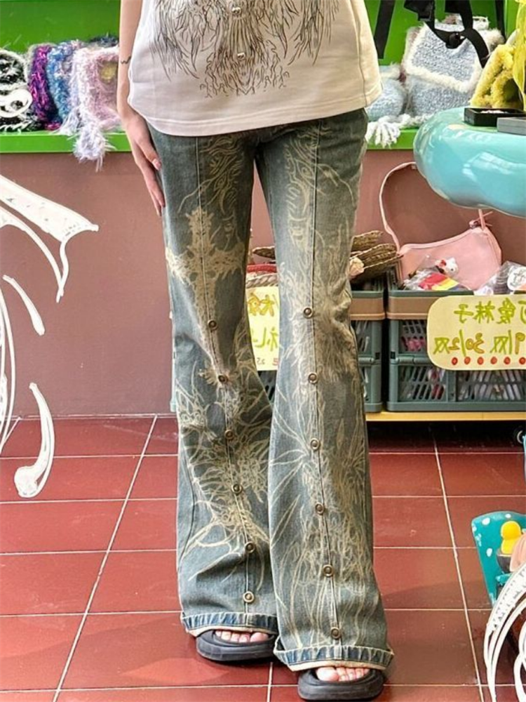 Vintage Flare Jeans Women Retro Print Slim Pant Female Sexy Spicy Girl High Waist Jean Lady Casual Punk Harajuku Straight Pants