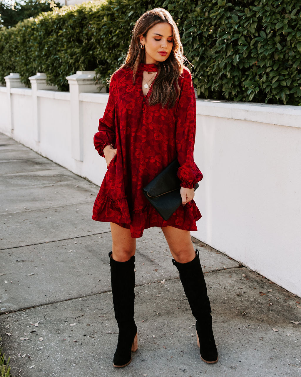 //InsStreet Exclusive// We can't wait to wear our Mazy Pocketed Floral Keyhole Dress at all of the holiday parties this season! This gorgeous wine colored mini features embroidered florals. Finished with an adjustable waist tie and side pockets. Styled with the Mercury Hoops. Emperor Coin Necklace. Simple Bangle Bracelet. Stella Crossbody Envelope Zip Clutch. and Saint Slouch Boot.