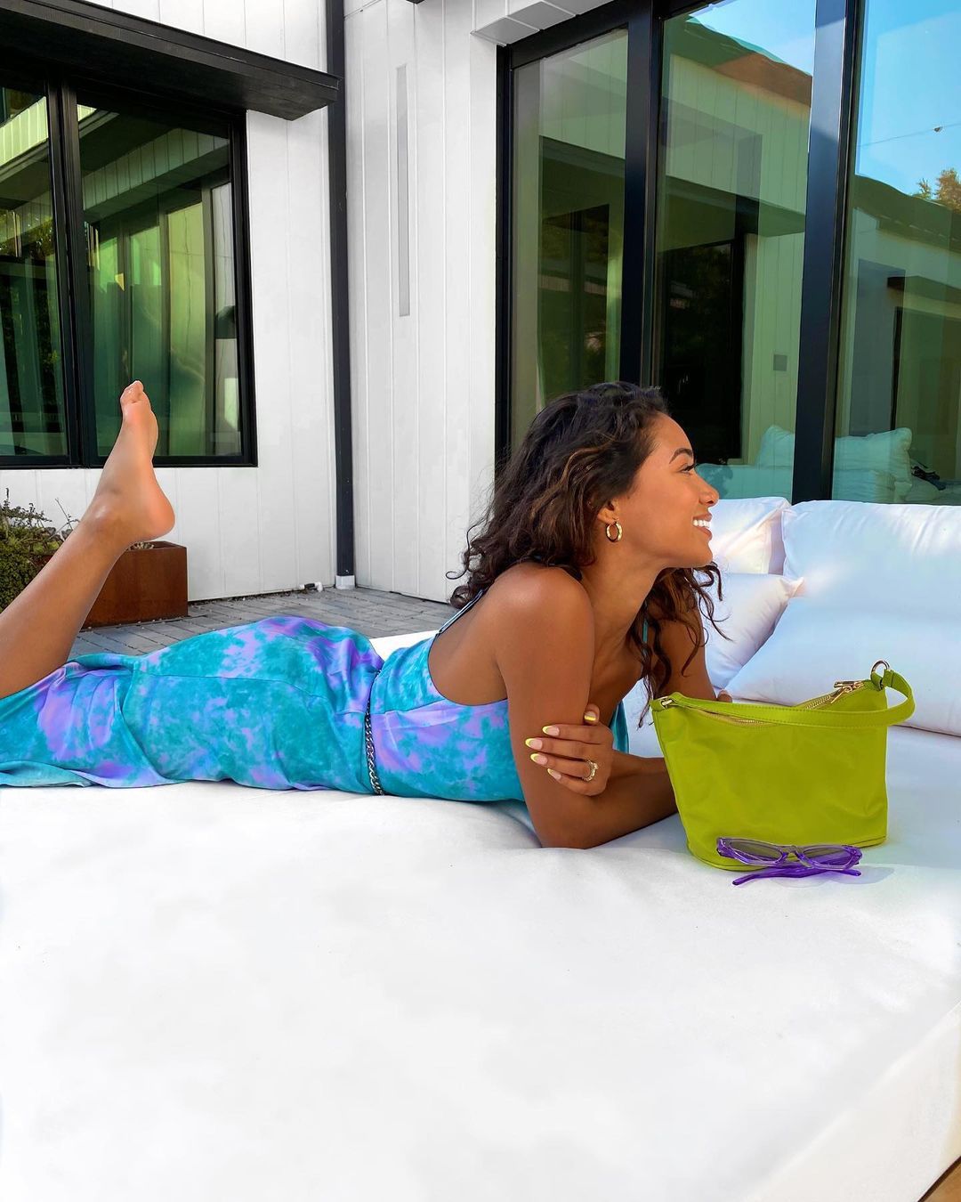 Chic and springy. the Eventide Printed Satin Midi Slip Dress in aqua and orange watercolors features a square neckline.