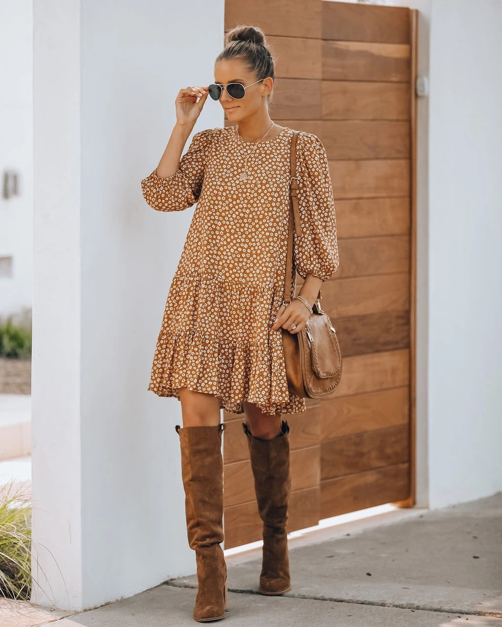 //INSSTREET// Our Bellini Floral Tiered Babydoll Dress is a beautiful fall forward transition piece! This stunning mustard dress features an ivory + mocha floral print throughout the relaxed fit. Designed with a crew neckline. billowed sleeves and elastic sleeve hems. Finished with a tiered skirt. back button closure and body lining. Styled with the El Dorado Hat. Love Connection Hoops. On Demand Herringbone Chain Necklace. Sia Toggle Pendant Necklace. Highland Bag. and Feminine Faux Suede Heeled Boot.