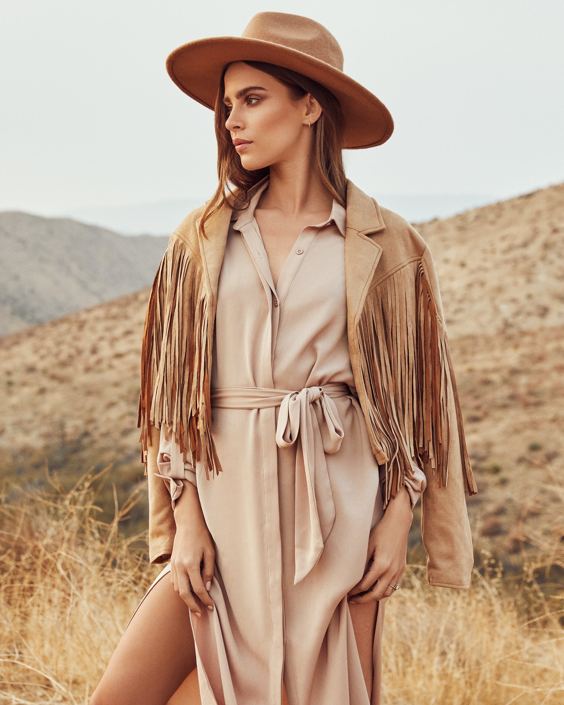//INSSTREET// A collared dress paired with a wide brimmed hat is a western themed dream! Our Betsy Button Down Midi Dress comes in a classic nude hue. Designed with an adjustable waist tie. Styled with the El Dorado Hat. Walford Cropped Fringe Faux Suede Jacket. and Dev Faux Suede Heeled Bootie.