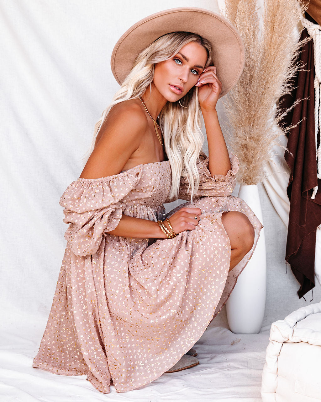 Our Bridgerton Metallic Swiss Dot Babydoll Dress comes in the cutest print! This nude blush swiss dot babydoll dress has gold metallic details and a square neckline with a concealed back zip closure. Adored for it's sleeves with elastic ruffle sleeve hems! Styled with the El Dorado Hat. Perfect Hoop Earrings. Cling Twisted Bangle Bracelet. Zoe Layered Herringbone Necklace. and Uptown Faux Suede Heeled Bootie.