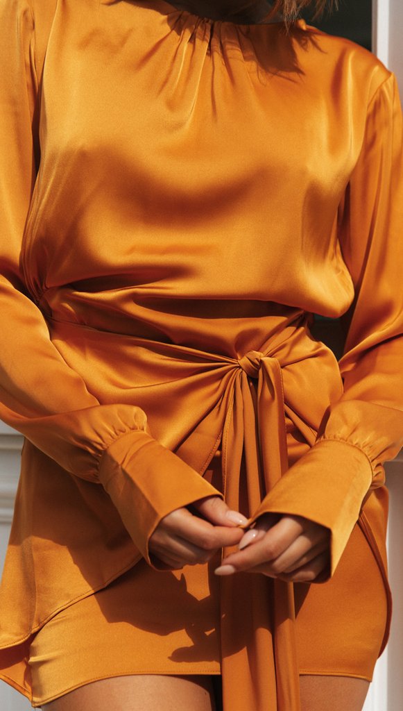 //INSSTREET// Demand attention in our Bright Idea Tie Front Dress! This bold. marigold dress has a neckline and elastic sleeve hems. Finished with a back elastic waist and a side adjustable apron tie. Styled with the Michaela Hoops. Lou Tag Necklace. Rope Chain Necklace. Initial Card Necklace. Clear As Day Chain Crossbody Handbag. Nikki Interweaved Bracelet. and Teigan Chain Strap Heel.