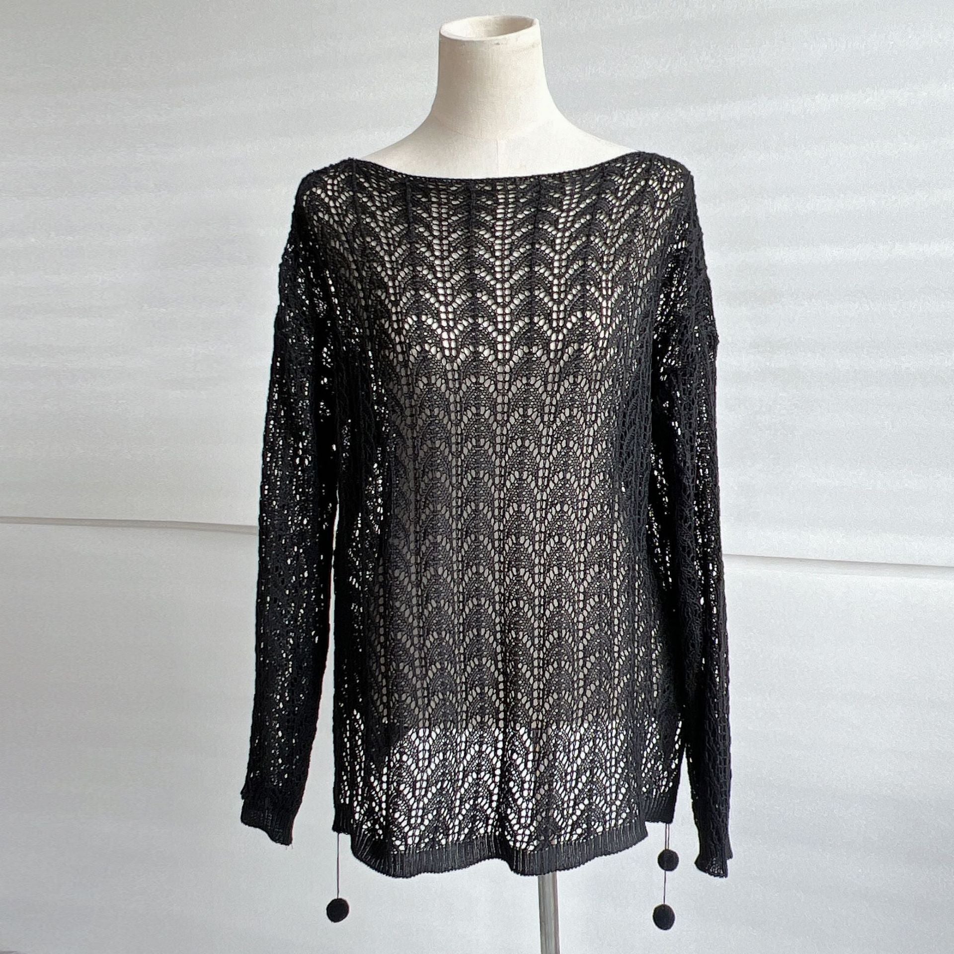 Hop on the crochet trend in the Temecula Sheer Crochet Dress in black with a wide neckline and an open back necktie.