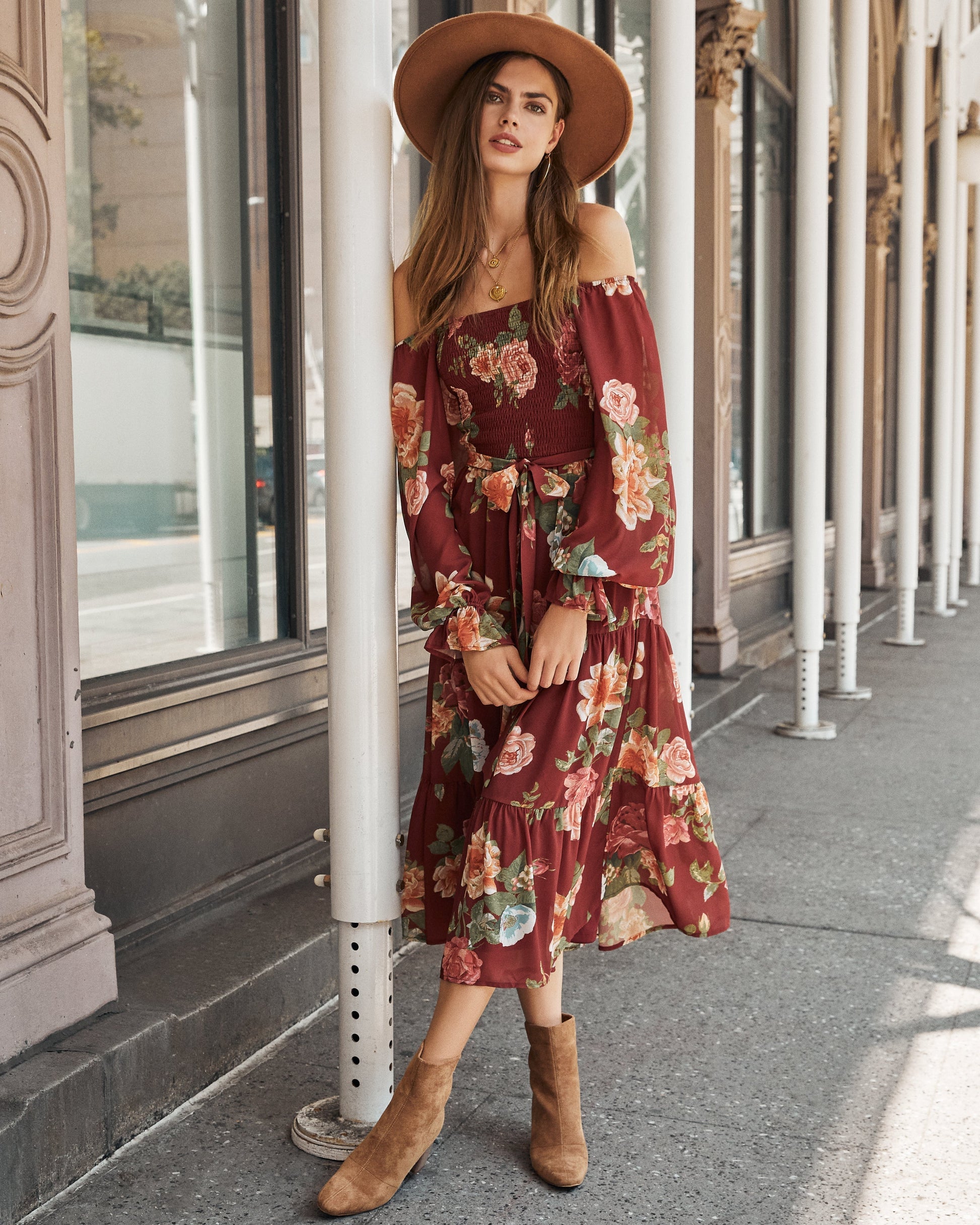 Go apple picking in our Claudette Floral Smocked Midi Dress! This burgundy dress features salmon. orange. taupe. lime. olive. blue. and ivory florals. Designed with an adjustable waist tie. Styled with the El Dorado Hat. Perfect Hoop Earrings. Gigi Double Coin Necklace. Walnut Fringe Shoulder Bag. and Colby Faux Suede Heeled Bootie.