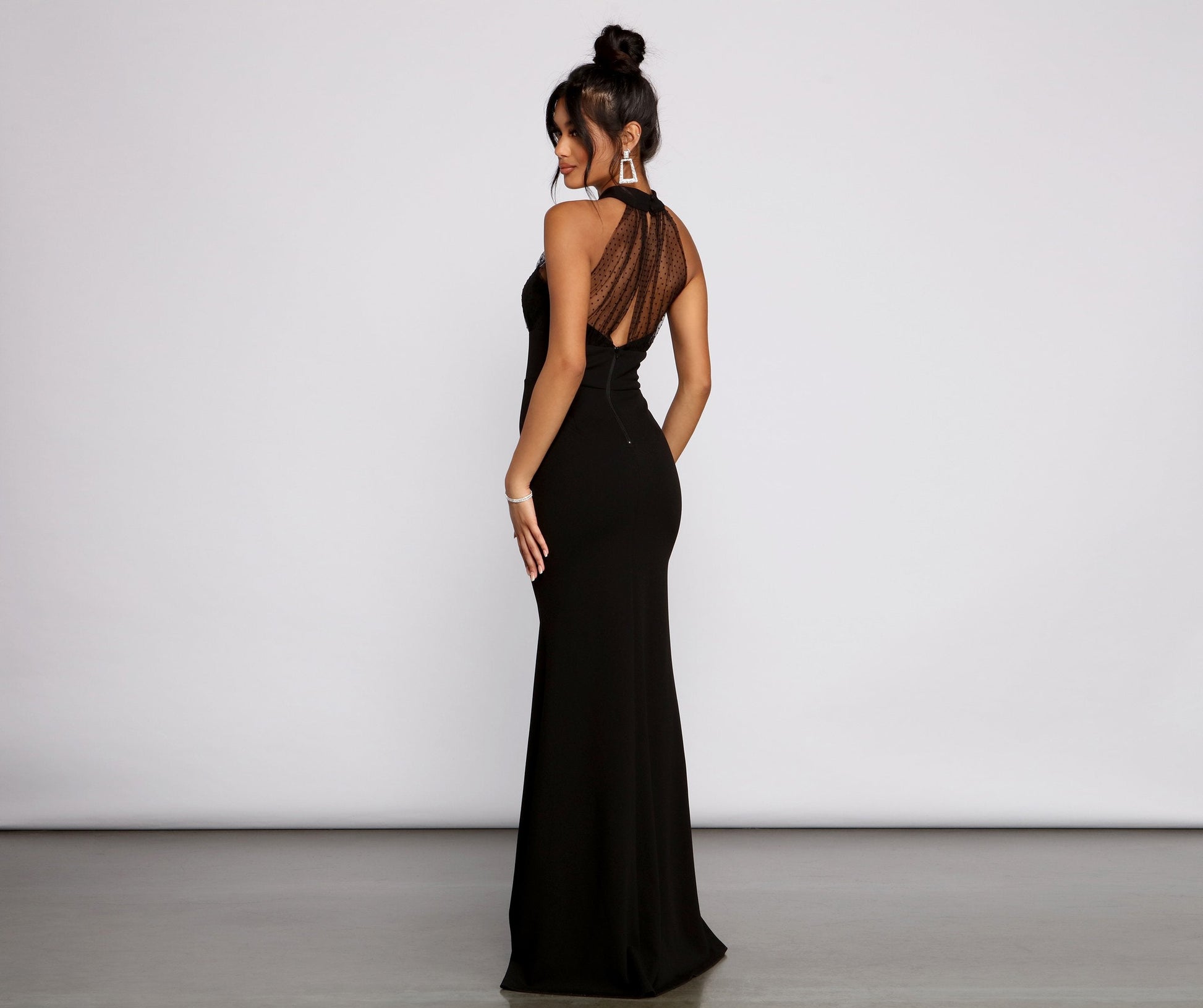 Bring the elegance in our glam Colette formal dress! She features a high round neckline with a sheer swiss dot mesh panel. a padded sweetheart bust. an empire waist. and a sheer mesh swiss dot back. Her relaxed fit waist leads to a curve-hugging mermaid silhouette. She is composed of a crepe fabric that offers a moderate stretch. Complete look with rhinestone heels and a rhinestone clutch.