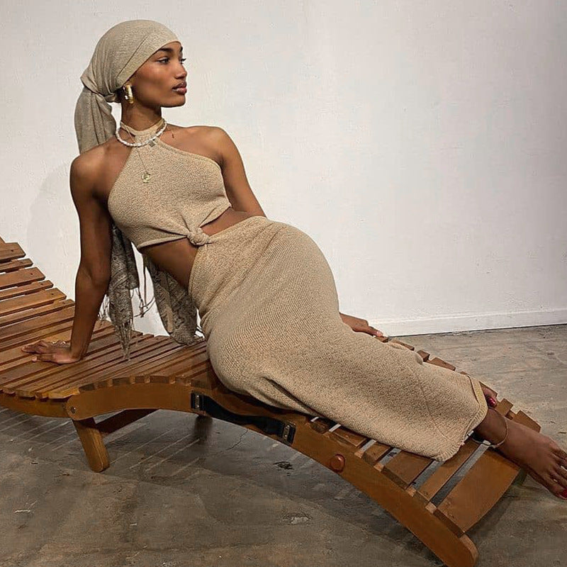 //InsStreet Exclusive// Be a little sultry in our Rita Cotton Cutout Halter Midi Dress! This sand cotton knit midi has a halter neckline and an adjustable tie closure. The waist cutout with a center knot detail is so sexy! Styled with the Ingram Fringe Earrings. Chloe Mini Necklace. Mosaic Coin Necklace. Simple Bangle Bracelet. Shashi Leela Clutch. and Cooper Block Heeled Sandal.